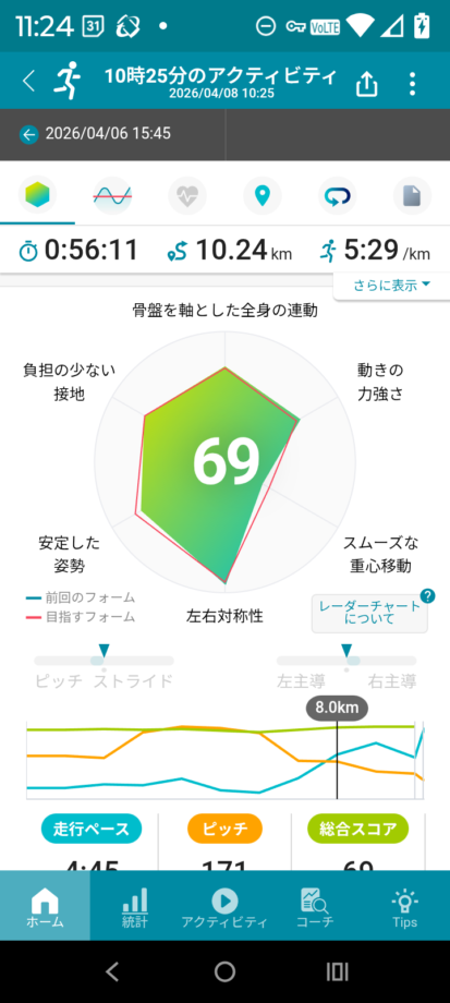 ロードを走っていないせいか、重心移動のスコアがとても低かったです。たまにはロードを走らないとですね。